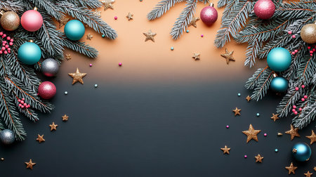 A top-down shot of a Christmas flat lay featuring gift boxes, fir branches, and shiny balls, with plenty of room for your own holiday message.