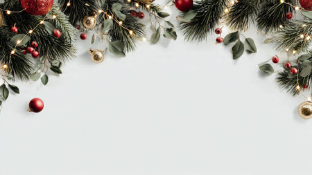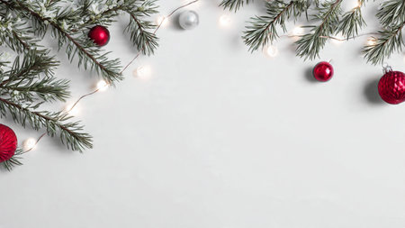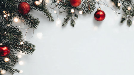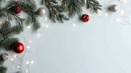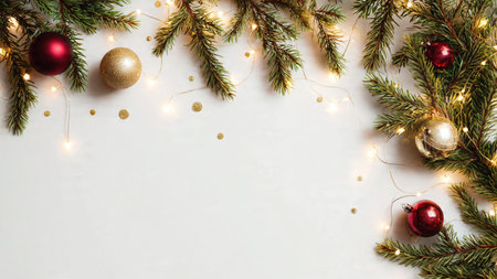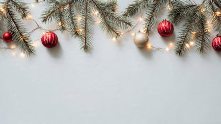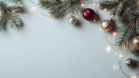 Modern Christmas background layout with pine branches, subtle ornaments, and glowing fairy lights.