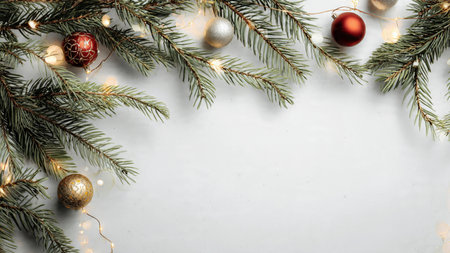 Festive Christmas scene with fir branches, ornaments, and lights.