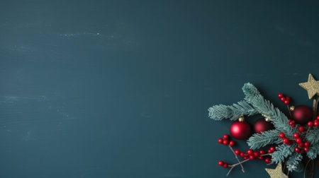 Christmas decorations with red baubles and berries on lush green pine branches. The dark green glittery background adds elegance to the festive composition.