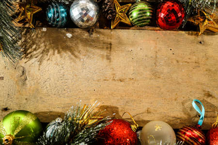 Christmas border template with fir branches, Beautiful red green blue and gold toys and ribbon,on space gray color background, Merry Christmas and Happy New Year.