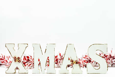 Season's greetings scene. Christmas decorations,gift boxes with red ribbons, Ñhristmas balls, rustic star, holly berries, frosty spruce branches, confetti on white backdrop, selective focus with blur