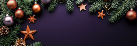 Christmas, New Year Festive Banner With Ornaments, Stars, And Fir Branches On A Two Tone Background