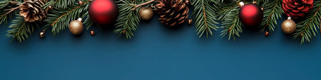 Elegant Christmas Fir Banner Mockup Featuring Red and Yellow Baubles Against a Blue Background