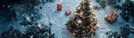 Aerial view of Christmas decorated tree with gifts on the ground in winter forest covered with snow and snowfall. Concept of Christmas celebration and standing out.