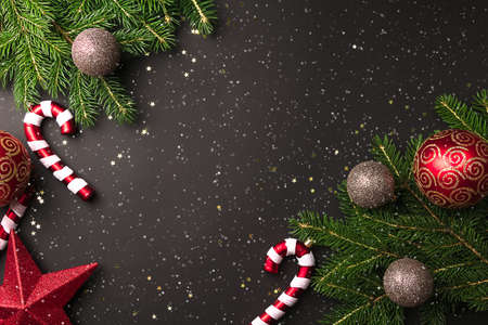 christmas tree branches with red and gold balls and candy cane on black background with snow in top view