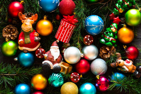 Christmas Holiday Season background with decorations. Merry Christmas New Year collection, gifts and decorative ornaments. Empty copy space for text.