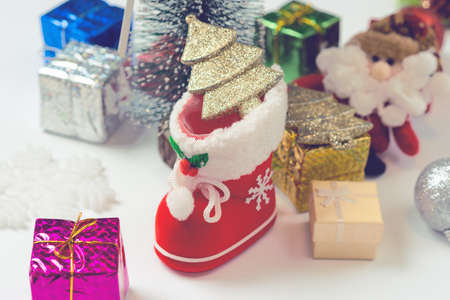 Santa Claus doll, gift box present and christmas ornament for christmas greeting seasonal background. selective focus