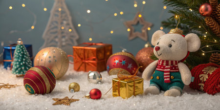 Soft teddy bear sitting beside a festive box filled with bright Christmas ornaments among gifts and tree lights. Christmas background.