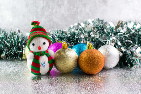 Selective focus of cute little snow man sitting on Christmas decorations and holiday decor with Christmas tree behind