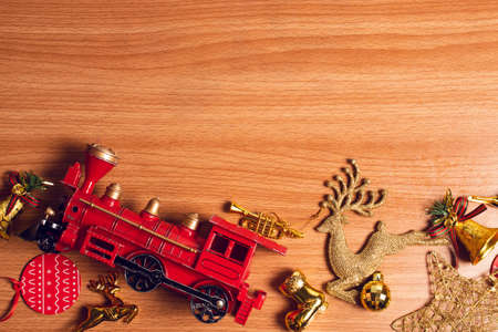 vintage raleway train with toy decoration luxury in top view flatlay of merry christmas holiday season greeting happy new year concept on wood background