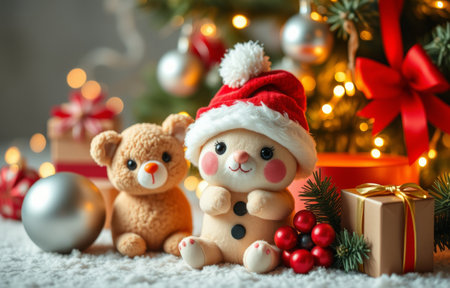 Christmas ornaments, Santa figurines, festive decorations, colorful baubles on a background of shimmering lights A joyful arrangement full of holiday spirit