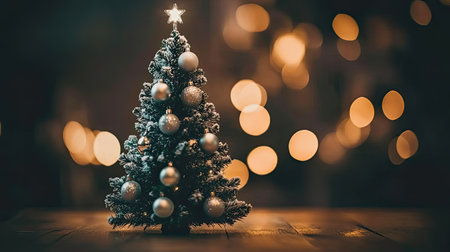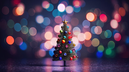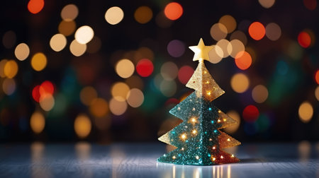 Tiny Christmas Tree toy on the table. Symbol of winter holidays with bokeh lights. Generated AI.
