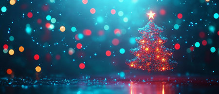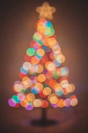 A dreamy image of a Christmas tree decorated with multicolored lights captured in a bokeh effect. The glowing star topper and blurred circular lights create a festive and magical atmosphere.