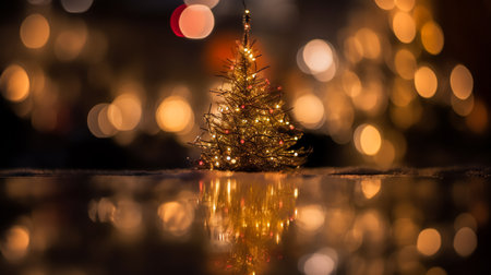 Beautifully adorned Christmas tree on a golden backdrop with glowing bokeh lights. Perfect for creating warm, festive ambiance in holiday greeting cards, seasonal designs, or Christmas promotions