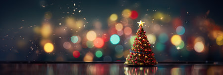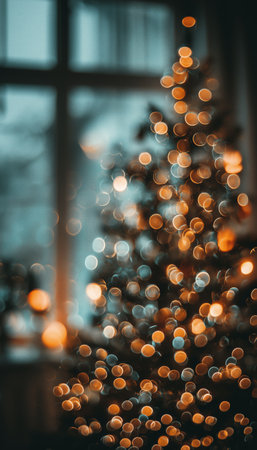Bokeh lights shimmer on a Christmas tree, creating a cozy, cheerful holiday atmosphere.