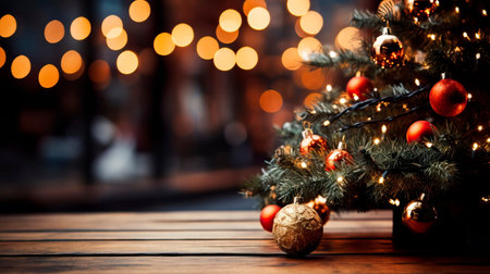 Soft, shimmering bokeh lights envelop a festive indoor scene, highlighting elegant gold and crimson ornaments on a beautifully decorated Christmas tree.