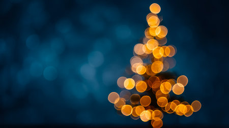 Twinkling amber fairy lights form the silhouette of a holiday tree, set against a deep navy blur that evokes cozy winter nights and festive cheer.