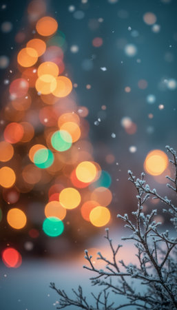 A beautifully blurred Christmas tree adorned with vibrant, colorful lights glows softly in the background, creating a warm and festive atmosphere. In the foreground, delicate snowflakes gently fall upon frosted branches, enhancing the enchanting winter scene and evoking feelings of joy and nostalgia.