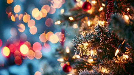 Christmas tree branches adorned with warm glowing lights, creating a cozy and festive atmosphere during the holiday season, set against a blurred, soft focus background