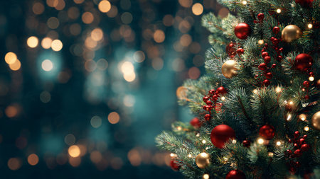 A festive and cozy close-up of a Christmas tree adorned with red ornaments and twinkling lights, with a soft bokeh background.