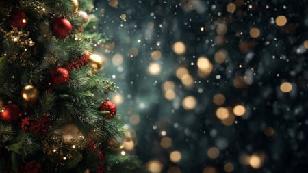 A festive and magical close-up of a Christmas tree adorned with red baubles and twinkling lights, creating a bokeh effect in the background.