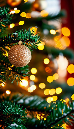 Christmas tree adorned with golden ornaments and sparkling lights, creating a warm and festive atmosphere for the holiday season. The image captures the magic and joy of christmas