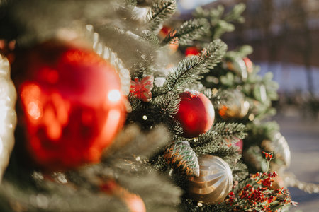 Close up of part of Christmas tree with different christmas toys and garland on street in evening city. Coniferous tree with decorative decorations to create festive mood.