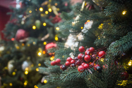 Christmas decoration in a Christmas tree. Christmas greeting card or background.