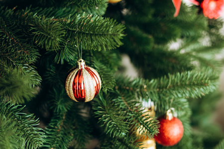 A vibrant red and gold ornament is seen hanging from the branches of a lush green Christmas tree. The decor adds a festive touch celebrating the joy of the holiday season in a cozy atmosphere.