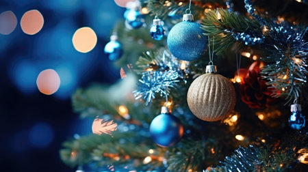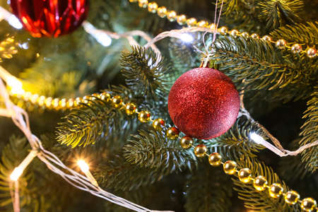 Close up of balls on christmas fir tree. Bokeh light garlands in background with copy space. Merry christmas and happy new year