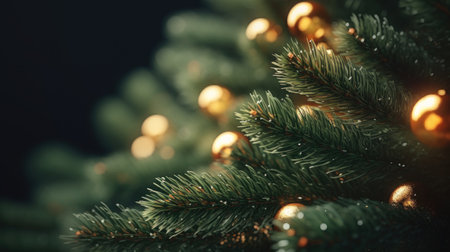 A close-up shot of a decorated Christmas tree, showcasing warm lights and ornaments. The focus is on the details of the branches and decorations, creating a festive atmosphere.