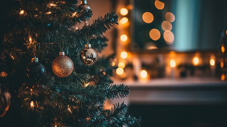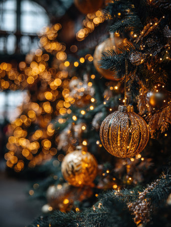 Christmas tree adorned with golden ornaments and sparkling lights, creating a warm and festive atmosphere for the holiday season. The image captures the magic and joy of christmas