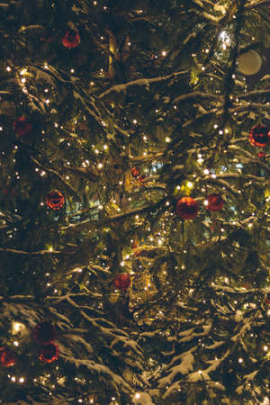 Close up of part of Christmas tree with different christmas toys and garland on street in evening city. Coniferous tree with decorative decorations to create festive mood.