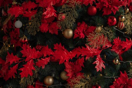Christmas Tree. Christmas tree background. Beautiful decorated christmas. Holidays concept. New Year. Red decorations on the Christmas tree.