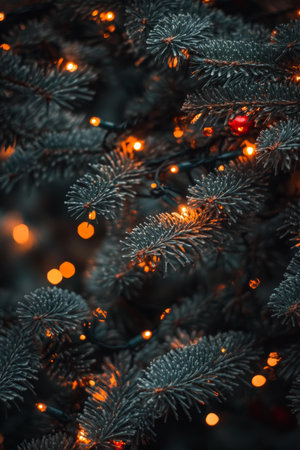Christmas concept and background with pine tree branches, lights and balls. happy new year. selective focus.
