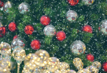 Close up Christmas tree decorated with silver and red Christmas balls. Snow Effect Soft Focus. Copy Space Concept