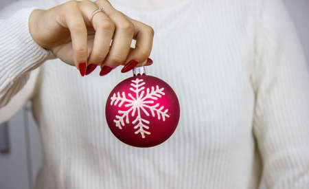 Female hand holding a Christmas toy isolated on white background