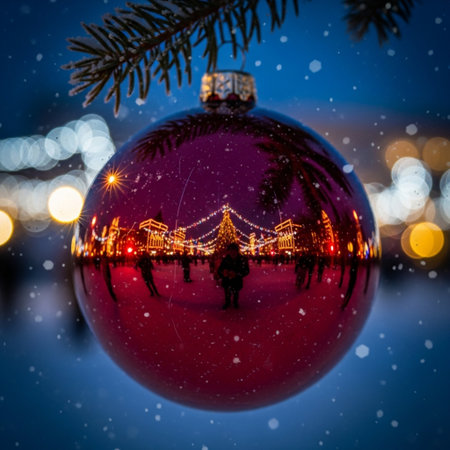 A stunning close-up of a Christmas ornament captures the festive spirit of the season, blending vibrant colors and soft bokeh in a beautiful winter evening scene.