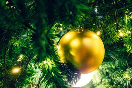 Golden ball ornaments hanging on Christmas Tree to decorate it for Seasonal Holiday