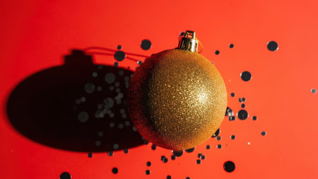 Golden Christmas ball on red background with falling confetti. Christmas and New Year concept.