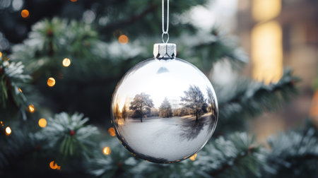 Silver christmas ball hanging on a christmas tree with bokeh background