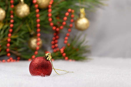Christmas background with a red ornament, golden gift box, berries and fir in snow