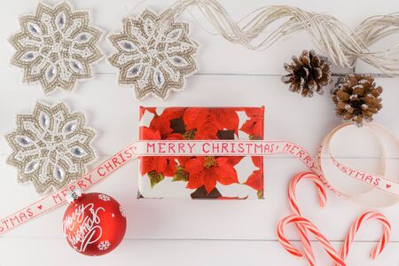 Top view of Christmas decorations background on white table background with copy space, concept of holiday celebration.