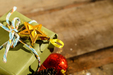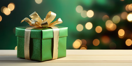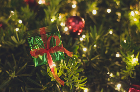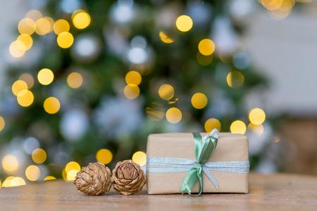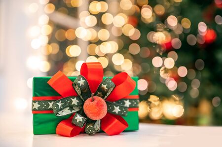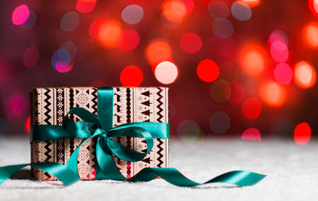 New Year or Christmas gift box with ribbon decorated, background light bokeh.