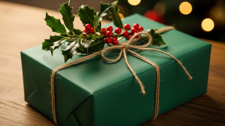 Christmas gift box with holly berry on wooden table in front of christmas tree