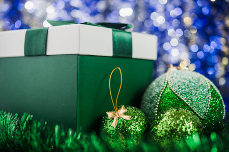 Christmas concept with lots of lights, colors, garlands, present box and balls