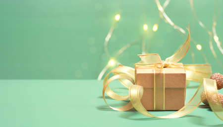On a light green background with a garland, there is a box with a gift and a gold ribbon. Copy space, selective focus on the gift.
