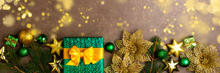 Christmas background with gift box, lights and decorations on dark background. Holidays, Christmas, celebration concept. Long format for banner