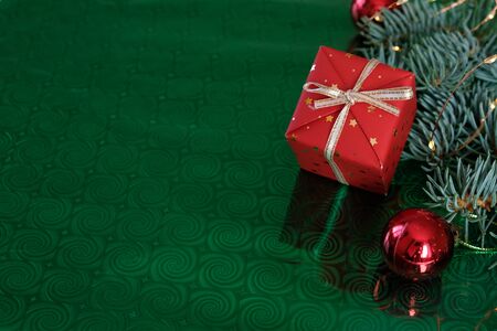Merry Christmas! Stylish Christmas gift with red ribbon and green fir branches, red berries and gold ornaments on green background. Xmas background. Season's greetings